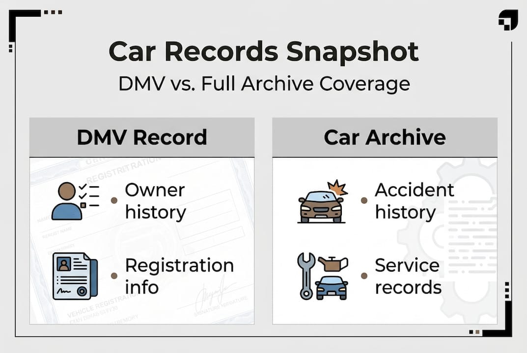 DMV records cover basic registration and plate history only, while a car record archive includes accidents, odometer data, service logs, and title brands compiled from dozens of independent sources.