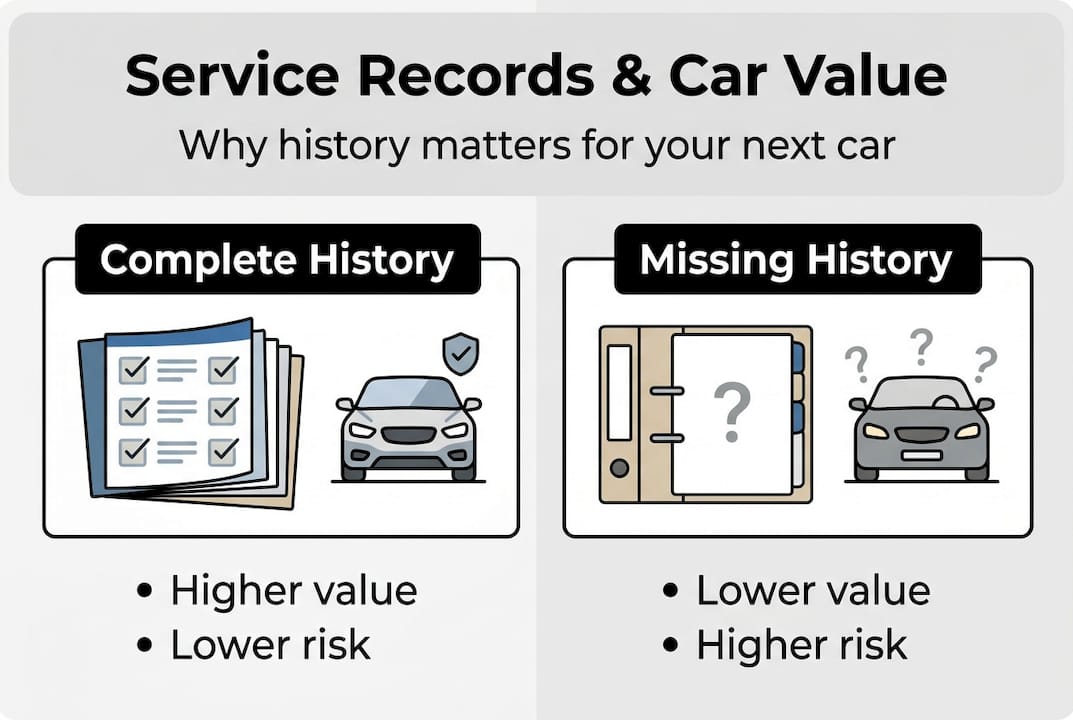 Service history isn't just about reliability. It directly affects how much a car is worth, both when you buy it and when you eventually sell it. The financial impact is bigger than most buyers expect.